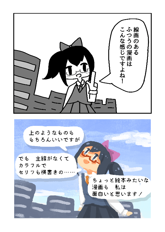 もうひとつ、主線なし絵は最近は描いてる人多いけど、主線なし漫画はどちらかというとかなりレア